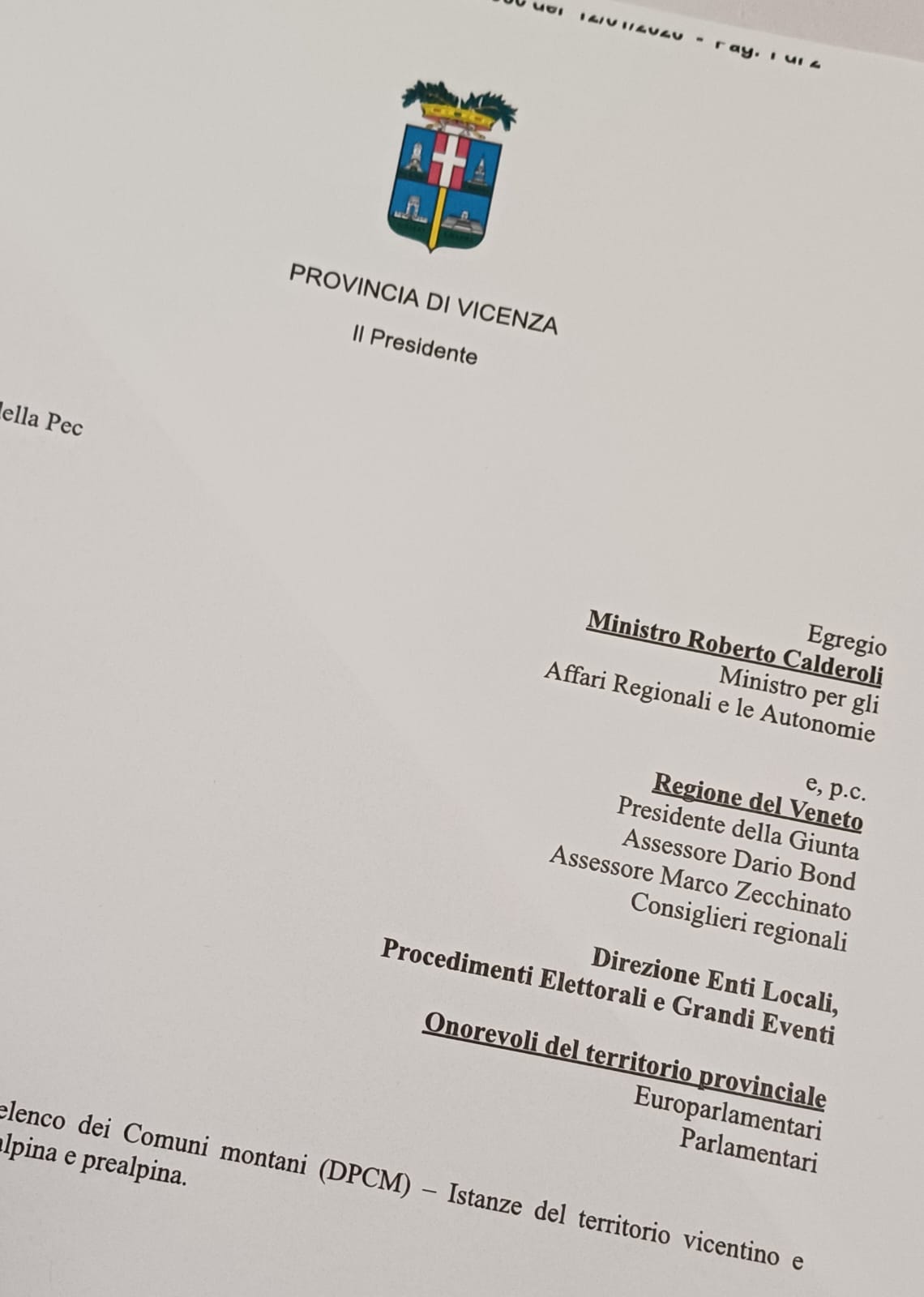 Classificazione comuni montani: la Provincia di Vicenza scrive al Ministro Calderoli . “No a criteri rigidi: a rischio i fondi e la tutela per la fascia pedemontana e collinare”