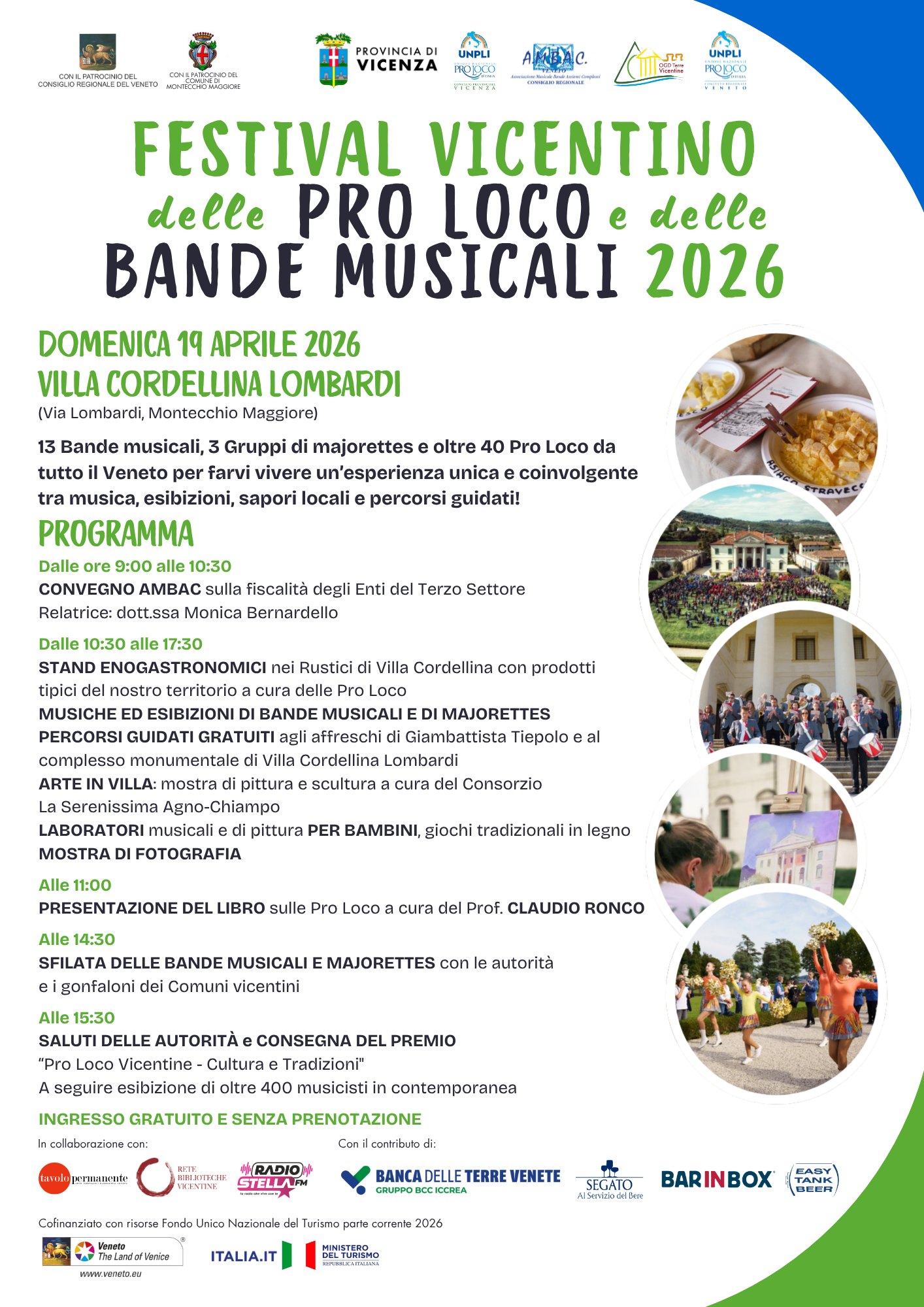 Per l’intera giornata verranno proposti esibizioni di bande musicali e majorettes, laboratori di musica, pittura e giochi per bambini, percorsi guidati al complesso monumentale di villa Cordellina e ai suoi affreschi. Le pro loco saranno presenti con stand dedicati alle eccellenze enogastronomiche locali, il tutto accompagnato da una degustazione di vini vicentini.