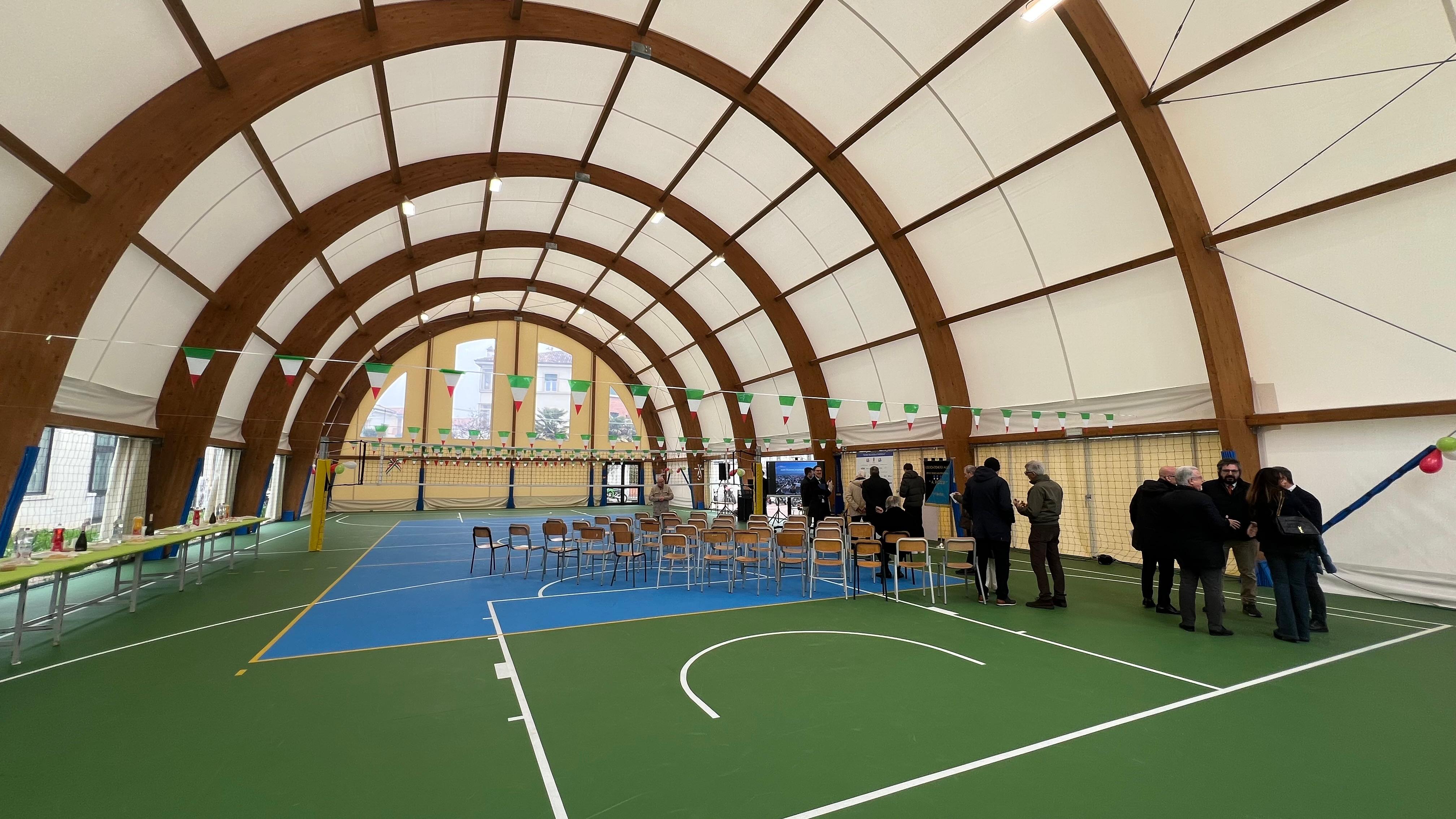 La copertura del campo sportivo, che ne permette l’utilizzo anche nei mesi invernali o in caso di condizioni meteorologiche avverse, ha un’altezza massima interna di 10 metri. E’ costituita da una travatura principale composta da sette archi curvi in legno lamellare. Il telo di copertura è costituito da una membrana a involucro unico in tessuto sintetico ad alta tenacità, ignifugo e antimuffa. La membrana, sagomata su misura, è stata tesa fino a terra nelle testate e, sui lati lunghi, fino a un’altezza di 2,40 metri da terra.