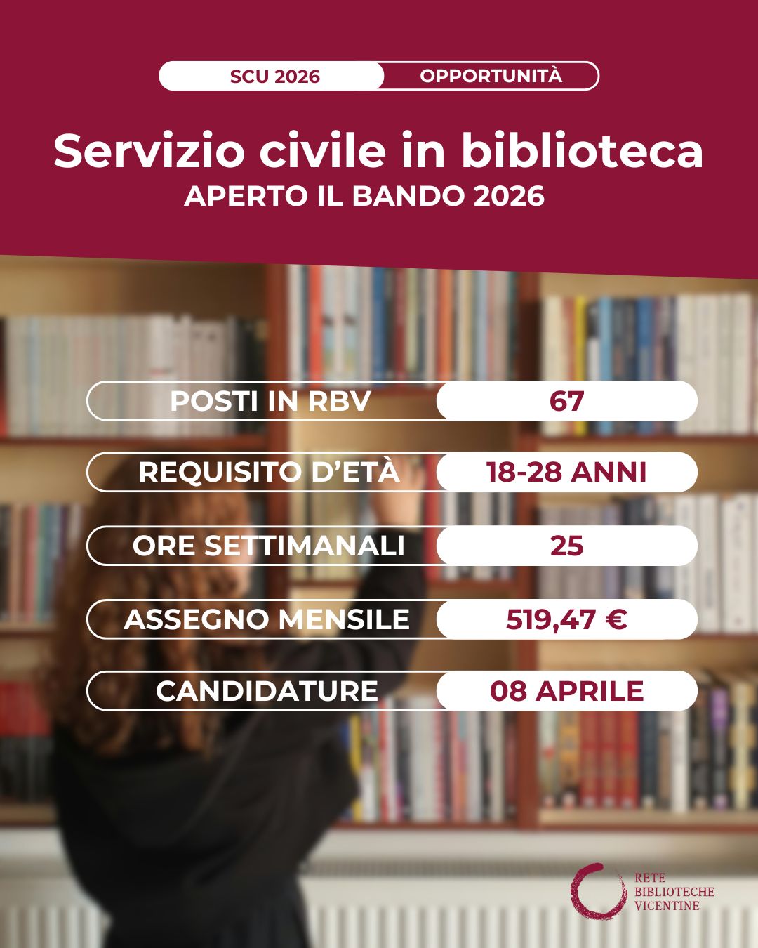 Vicenza, marzo 2026 – Servizio Civile in biblioteca: si può. Sono ben 67 i posti disponibili per giovani che aderiscano al bando del Servizio Civile Universale 2026, in 29 biblioteche che fanno parte della Rete Biblioteche Vicentine.
